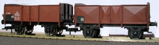 Abb. 4: In dieser Ansicht erkennt man gut, daß am Fahrwerk von Märklin (rechter Wagen) die Wagenkastenstützen fehlen sie befinden sich am Wagenkasten des O 11 und reichen nicht bis an den Langträger heran