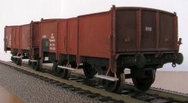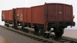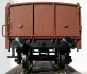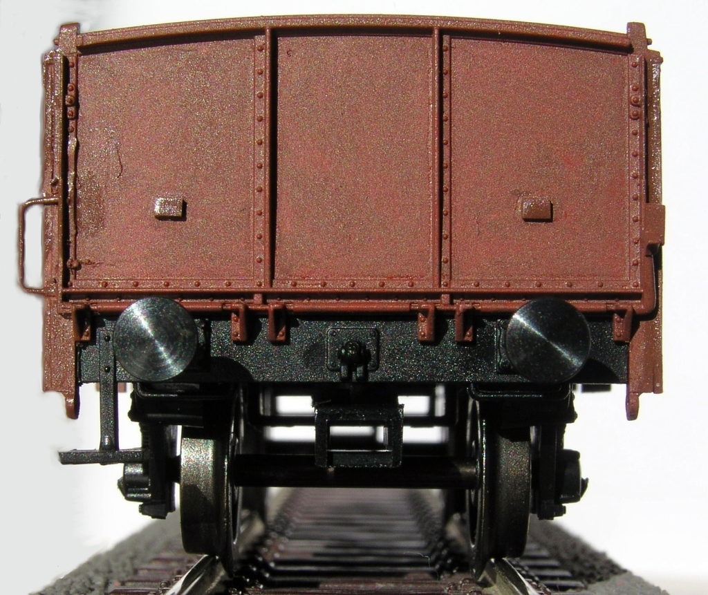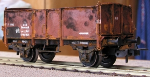 Nachdem die Tritte am Fahrwerk und am besten das gesamte Fahrwerk auch mattschwarz lackiert sind, kann man auch hier Beschriftungen anbringen. Die Fotos vom Vorbild zeigen, wo was hingehört. Die Bremsecken am Wagenkasten habe ich mit dem Pinsel aufgemalt es sind im Beschriftungssatz allerdings auch solche zum Aufbringen mit Wasser dabei. Anschließend habe ich den Wagen mit Pulverfarben gealtert diesmal "zweistufig": Erst Rost und Dreck in verschiedenen Braun- und Graubrauntönen sowie Kohlenstaub von der üblichen Ladung solcher Wagen, die dann mit klarem Mattlack aus der Spraydose fixiert wurden, anschließend habe ich in den noch nicht angetrockneten Klarlack noch einmal Kohlenstaub eingearbeitet.