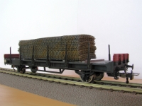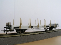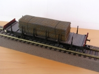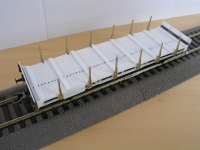 Nach dem Zerlegen und Zersägen des Wagens wird daher dieser seiner Ladefläche beraubt. Eine neue, etwas längere (aber nicht lang genug, um das "k" in der Gattungsbezeichnung um 1960 herum loszuwerden) entsteht aus Polystyrolplatten und -profilen, danach werden die Langträger mit PS-Profilen ergänzt. Die beim Vorbild (und auch beim Ausgangswagen) abnehmbaren Stirnborde werden mit ihren Rungen in die stirnseitigen Rungentaschen eingepaßt und auf der Ladefläche Ladeschwellen verteilt.