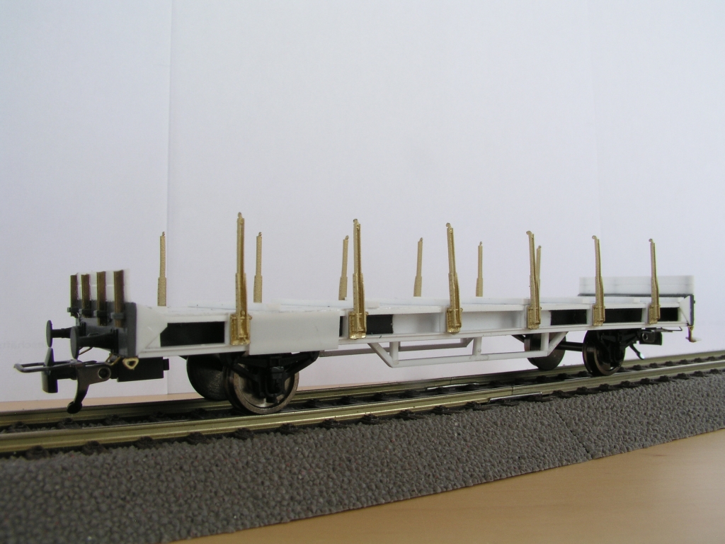 Die letzten Schritte sind das Anbringen von Teilen aus Messing: Seilösen von Weinert, Rangiergriffe unter den Puffern aus 0,3mm starkem Messingdraht und man gönnt sich ja sonst nichts! Rungen der Verbandsbauart aus dem Bahnsinn-Shop. Die von Weinert täten es auch je nach verwendeten Rungen muß natürlich deren Aufnahme am Rungenrahmen gebaut werden. Ach ja ... und Rangiertritte bauen wir aus Heftklammern und PS-Profilchen das spart dann wieder Geld! Irgendwo möglichst unsichtbar (etwa im Bereich, wo der Langträger verlängert wurde) verstecken wir noch ein wenig Blei, damit der Wagen auch ein wenig Gewicht mit sich bringt.