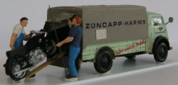 Ein passendes Ladegut findet man am ehesten bei Artitec oder DAVO. Dirk und Patrick (ein englisches Muskelpaket) laden hier gerade eine neue BMW R 69 ein, die unter einigem Fluchen aus einem DAVO-Resinbausatz zusammengepfriemelt und unter noch mehr Flüchen lackiert wurde (wobei ich feststellte, daß die Bauanleitung netterweise den Anbau der Auspuffrohre ausläßt) letztlich kommt aber ein tolles Zweirad dabei heraus!