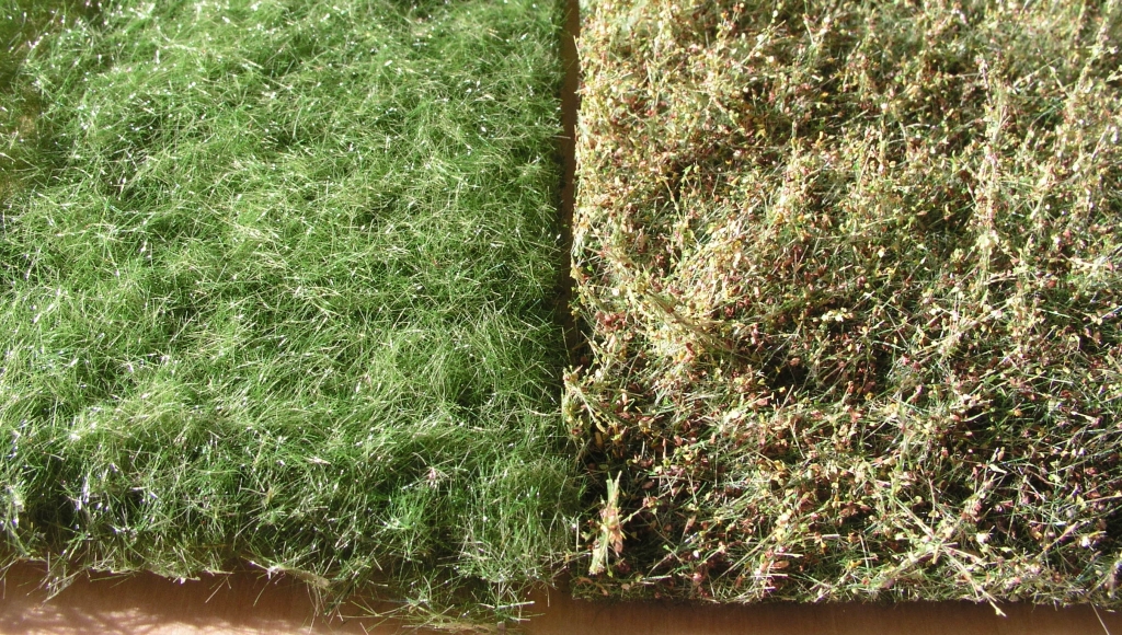 Zumindest die bei BMA auf der Messe erhältlichen Matten sehen recht wild aus eben nach Gestrüpp und Wildnis. Der Untergrund ähnelt stark dem von entsprechenden MiniNatur- oder Heki-Produkten, jedoch sind die Matten teilweise bis zu 2 oder 3 Zentimeter hoch und die Struktur ist viel unregelmäßiger.