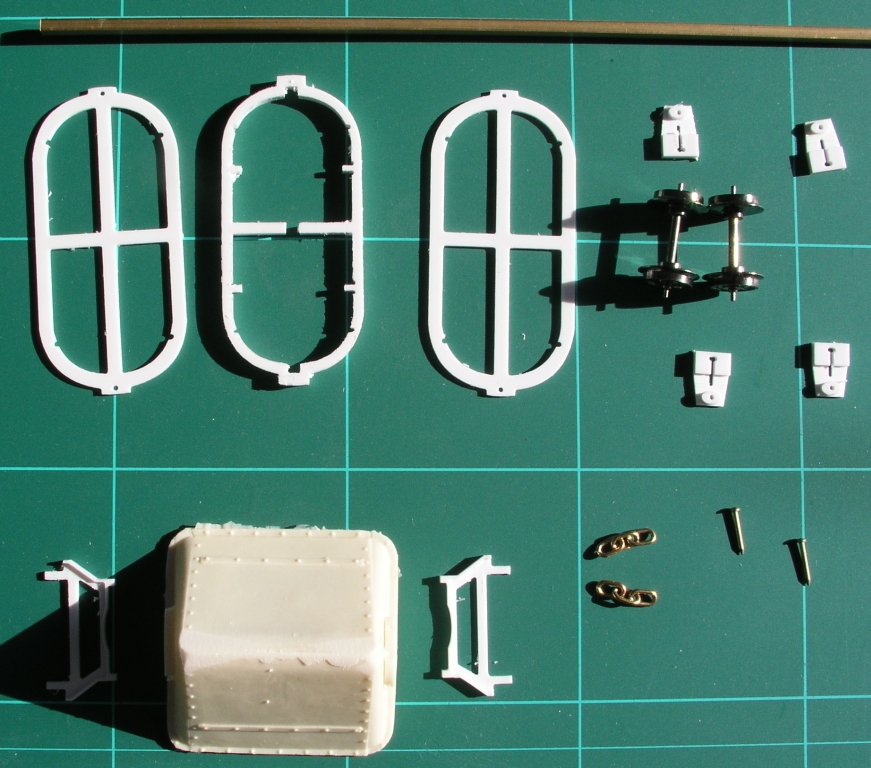 Die Lorenbausätze von Lokführer Lukas bestehen hauptsächlich aus gefrästem Polystyrol, die eigentliche Mulde ist ein Formteil aus Resin. Den Rahmen baut man am besten zusammen, indem man die Nägel, die als Kupplungshaken mitgeliefert werden, durch die passenden Löcher eines beiden der flachen Rahmenteile steckt (natürlich ohne Klebstoff!). So kann man das mittlere, dicke Rahmenteil passend auflegen (Nägel einfädeln) und mit dem Unterteil verkleben. In den Mittelteil des Rahmens klebt man nun ein passendes Stück 3mmx3mm-Messingprofil (bei meinen Bausätzen lag keines dabei, es ist aber in Modellbau- oder Architekturmodellbaugeschäften leicht zu bekommen) und beschließt den "Sandwich" mit dem Einfädeln und Ankleben des oberen, dünnen Rahmenteils. Mit ein wenig Glück haben die Nägel keinen Klebstoff abbekommen und lassen sich jetzt gewaltlos entfernen.