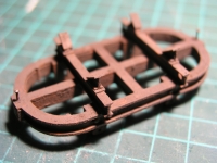 Als nächstes kamen zwei Querträger aus einem I-Profil aus Polystyrol an die Reihe, zusammen mit insgesamt 4 Keilen aus dem gleichen Material zum Festhalten des Tanks hier muß man ein wenig probieren, welchen Winkel die Keile haben müssen und wo man sie auf dem Träger anbringen muß. Lorenrahmen und Träger habe ich zuerst gründlich gewaschen und dann mit rostroter Emailfarbe grundiert.