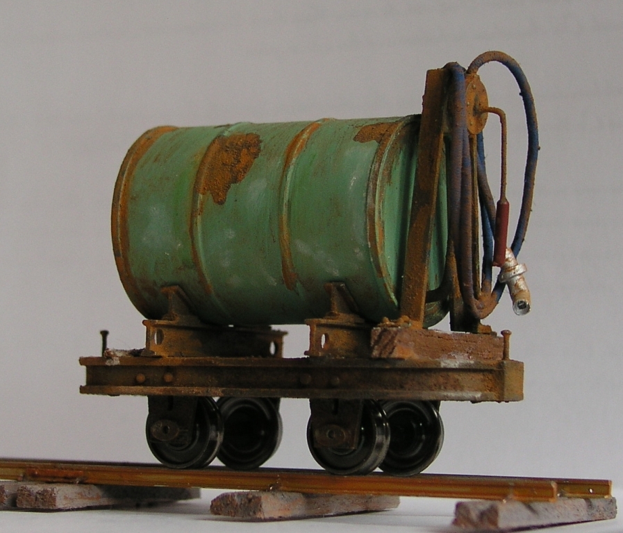 Nachdem alle Teile nun soweit fertig sind, wird alles nach und nach passend zusammengeklebt: Erst kommt der eigentliche Tank auf den Rahmen, dann die Tank-Vorderseite samt Rohr auf den Tank (so, daß das Rohr den Tank wirklich mittig unten verläßt). Das noch freie Ende des Rohrers fädelt man mit etwas Kleber in die Handpumpe ein, die man gleichzeitig auch auf dem Lorenrahmen befestigt.