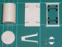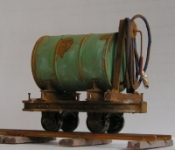 Mit meiner ersten Bestellung bei Sidelines kam neben einigen Lorenrahmen für diverse Eigenbau-Aufbauten auch eine Tanklore einfach, weil ich erst einmal ein Gefühl für die Größe (oder "Kleine"?) der Fahrzeuge haben wollte, ehe ich selber mit eigenen Aufbauten beginnen würde. Der Lorenbausatz besteht aus dem Rahmen mit Achshaltern, Kupplungsimitationen, einer Ladefläche mit Halterungen für den "Tank", zwei Teilen für den Tank (eigentlich ein Faß) und der Handpumpe aus Resin. Dabei liegen dann noch zwei passende Radsätze.